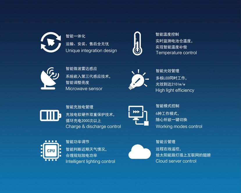 源碼不僅在產品的核心配件上追求高標準,在研發的技術領域更是引先于行業。源碼太陽能智慧路燈搭載了智能監測與控制系統,集智能一體化、智能微波雷達感應、智能充放電管理、智能功率調節、智能溫度調節、智能光效管理、智能模式控制、智能云管理八大核心技術為一體,通過核心技術的組合工作,使路燈更加智能化,有效延長了太陽能路燈的壽命,達到最佳照明效果。