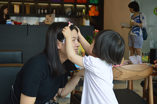 手工創(chuàng)作:剛從菜園里戀戀不舍離開,擁有無限的活力小朋友們?nèi)匀痪Τ渑妗=酉聛硎鞘止きh(huán)節(jié),小朋友在媽媽的指導下完成作品,代表自己的點點心意,親手送給媽媽。