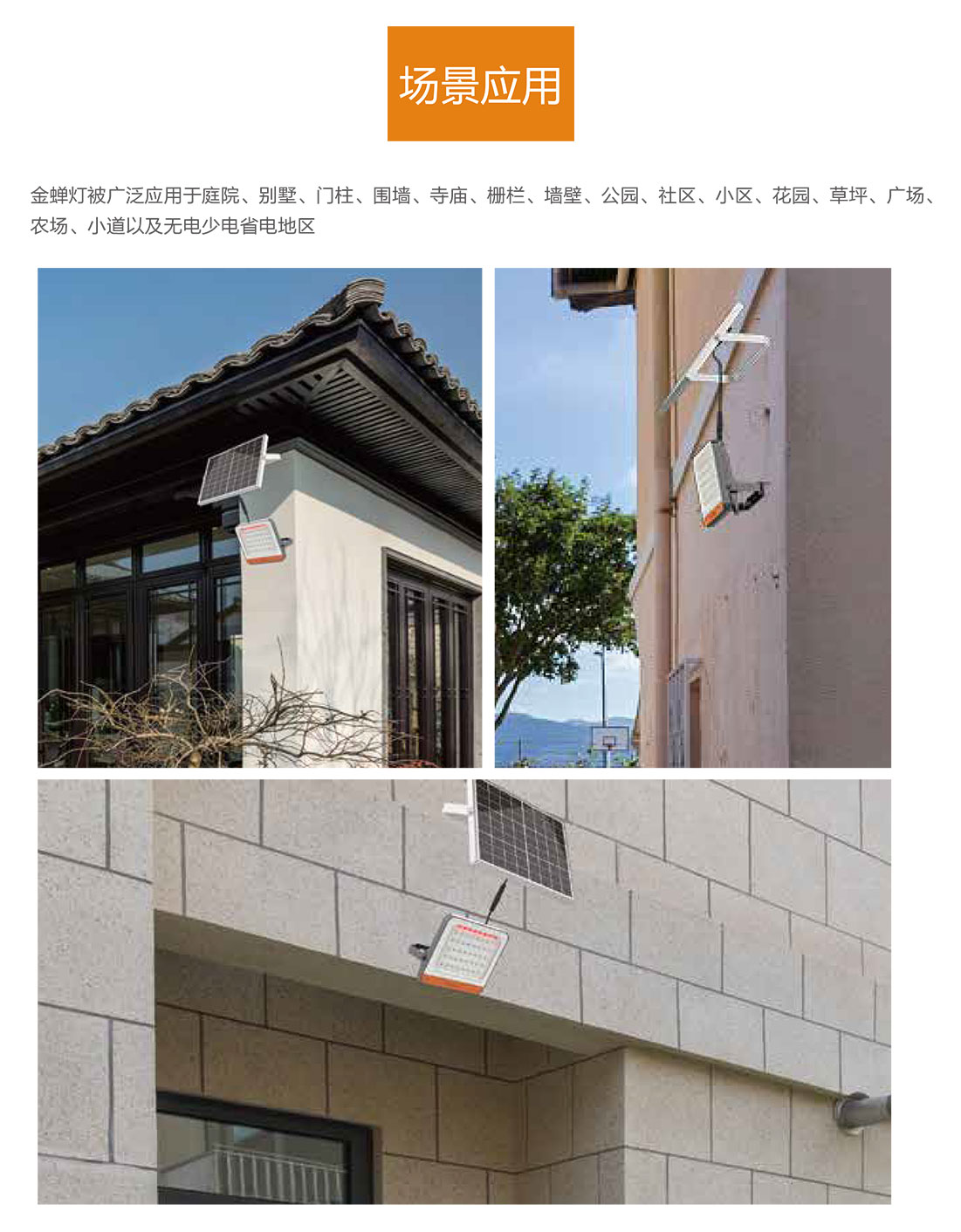 金蟬燈作為太陽能投光燈,被廣泛應(yīng)用于庭院、廣場(chǎng)、私家花園、別墅、寺廟、農(nóng)場(chǎng)、戶外廣告牌等場(chǎng)景。